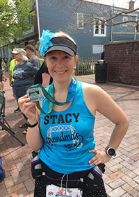 Stacy holds up a medal she earned from a running race.